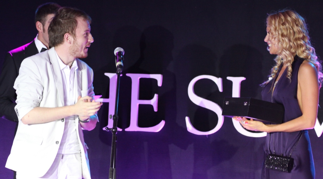 Директор по коммуникациям Rudolf Kämpf Артур Акопян вручает приз телеведещей Дарье Субботиной