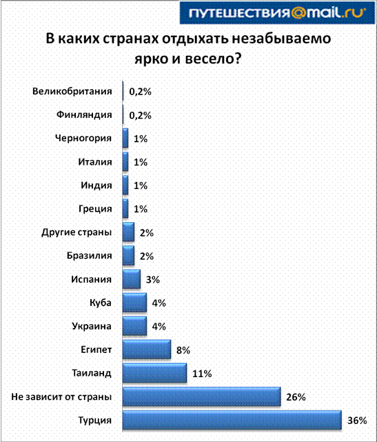 Больше трети респондентов (36%) ассоциируют с ярким и веселым отдыхом Турцию. Второе место досталось курортам Таиланда, за эту страну проголосовало 11% опрошенных. На третьей строке рейтинга – курорты Египта (8%).