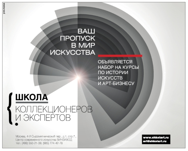 Задача Школы – приоткрыть дверь в мир искусства и арт-бизнеса, дать практические советы тем, кто только в него вступает. Школа является не только учебным заведением, но и клубом для людей, которые хотят сделать искусство образом жизни и ориентироваться в арт-рынке.