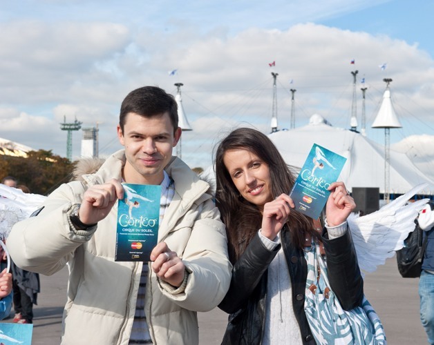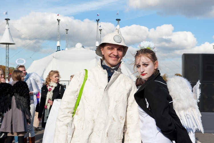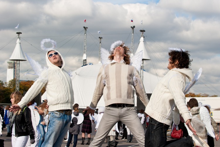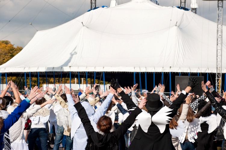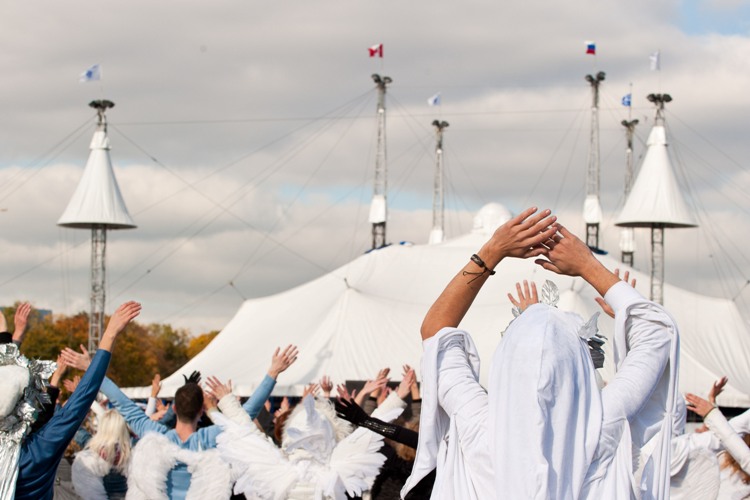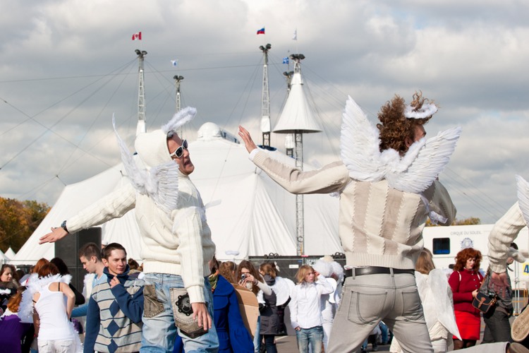 Появление Cirque du Soleil приветствовало около 1000 ангелов – творческих и незаурядных людей, которые, придумав себе неповторимый «ангельский» образ, получили приглашение от своих собратьев из шоу Corteo на одно из выступлений.