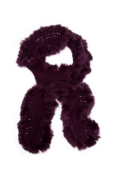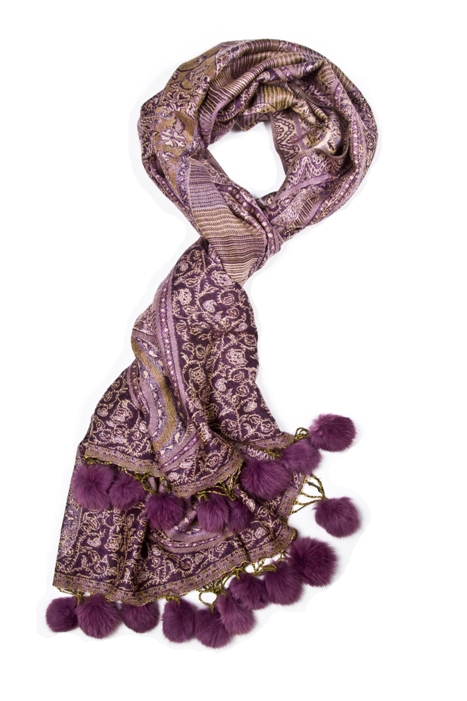Любительницы этники тоже могут порадовать себя уютным шарфом с меховыми помпонами цвета аметиста. Индийский орнамент и золотая вышивка в качестве акцента расскажут окружающим о Вашем интересе к тайнам Востока.