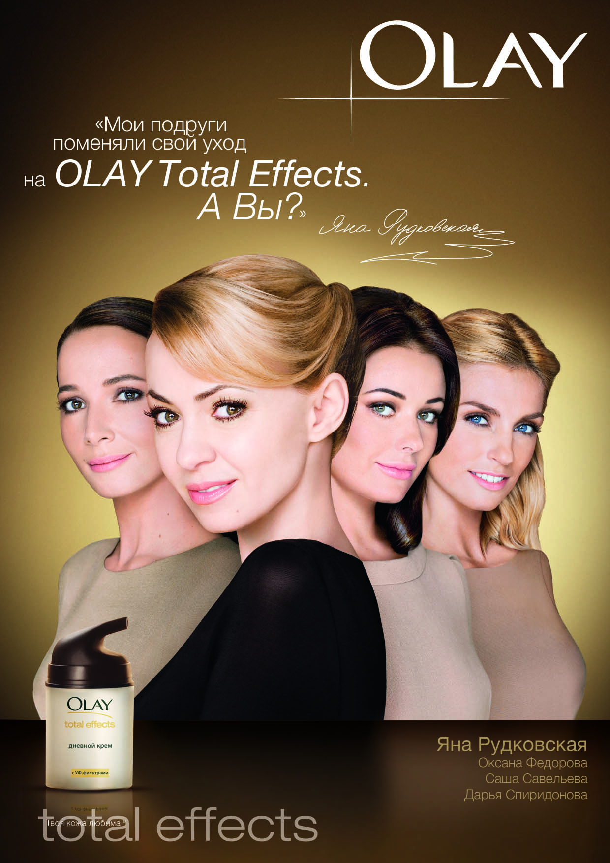 «OLAY – эта марка, которая вызывает у меня доверие и уважение. Именно поэтому я всегда с энтузиазмом рекомендую OLAY своим подругам. Оксана Федорова, Саша Савельева и Дарья Спиридонова уже оценили по достоинству средства моей любимой линии Total Effects, и я уверена, что они далеко не последние известные люди в многочисленном списке поклонников этой марки», – говорит Яна.