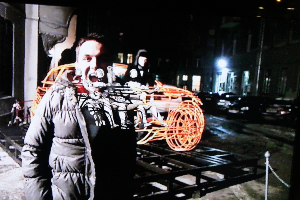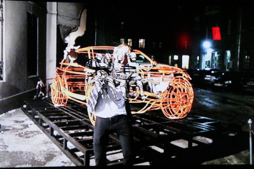 Аудиовизуальная инсталляция СОВМЕЩЕННАЯ реальность /AUGUMENTED reality продолжила идею выставки "Формы жизни": виртуальная жизнь, в которой существуют роботы, совмещается с реальностью, в которой существуем мы. Экран инсталляции – окно в мир комфорта и безопасности, созданный внутри RANGE ROVER EVOQUE: роботы беззаботно едут в автомобиле, двигаясь в ритм музыки.
