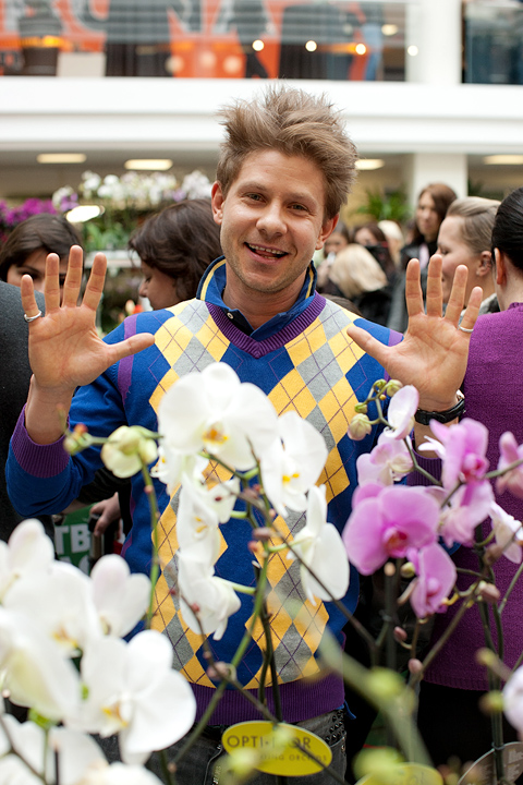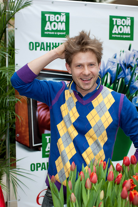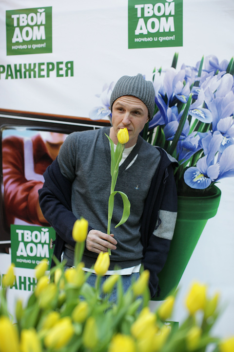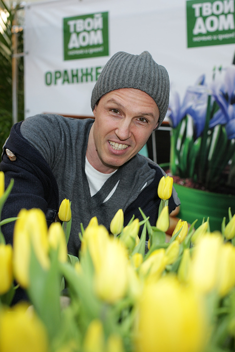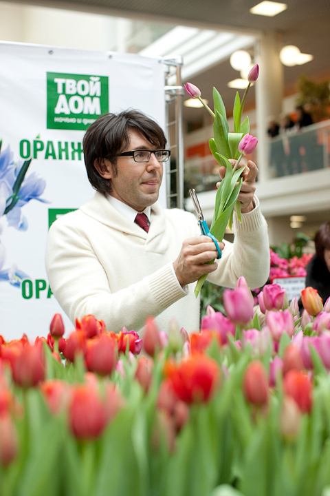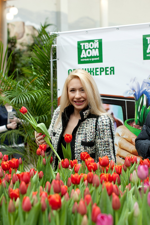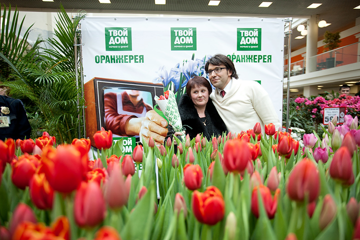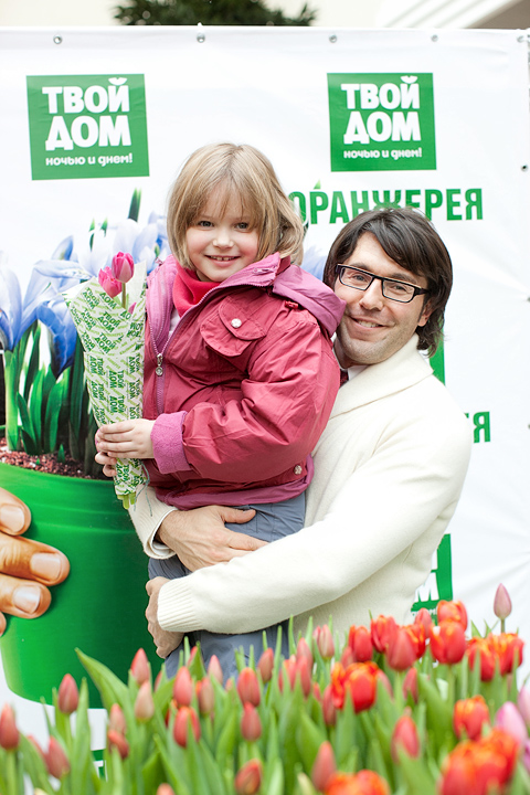 Следующим, к огромному изумлению и радости многих, в народ вышел актер Дмитрий Дюжев. Пока его супруга Татьяна старательно и аккуратно срезала с клумбы тюльпаны для посетителей оранжереи «Твой дом», Дмитрий прочел целую лекцию о том, как нужно относиться к женщинам. «Женщины – это как цветы. За ними нужно ухаживать, их нужно оберегать. Иногда они такие же капризные, хрупкие, но все-таки такие красивые! Преподносить букеты женщинам нужно не только по праздникам. Поводом может стать просто хорошее настроение – ваше или вашей возлюбленной. Во всяком случае, я стараюсь радовать мою Татьяну как можно чаще».