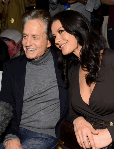 Кэтрин Зет-Джонс – в платье Michael Kors с запАхом шоколадного цвета с V-образным вырезом, в замшевых туфлях Mary Jane от Michael Kors, с клатчем из кожи крокодила и питона Michael Kors – все вещи из коллекции Michael Kors FW12.