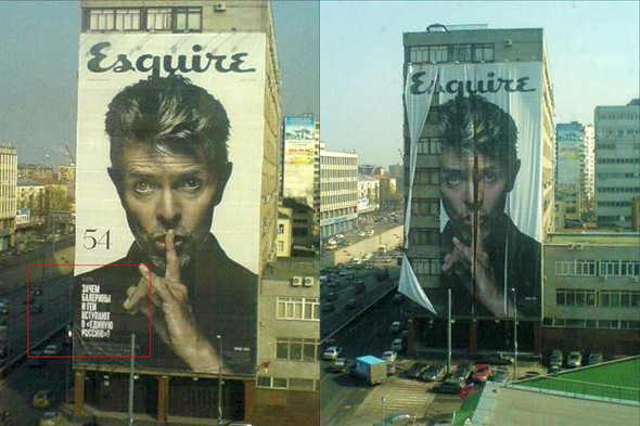 Плакат, в центре которого изображен Дэвид Боуи, появился на доме 40 по Сущевскому валу вчера, 29 марта, но провисел в своем первоначальном виде меньше суток: сегодня в первой половине дня сотрудники компании Sunlight Outdoor, разместившей плакат, сорвали ту его часть, на которой были напечатаны крамольные слова.