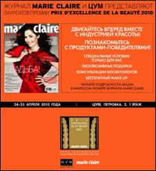 Кроме того, только 24 и 25 апреля всех посетителей ЦУМа ждет бесплатный макияж и, конечно, подарки и сюрпризы от Marie Claire. В специальной chill-out зоне журнала Marie Claire читательницы смогут расслабиться, полистать последние номера журнала, выпить кофе или бокал шампанского.