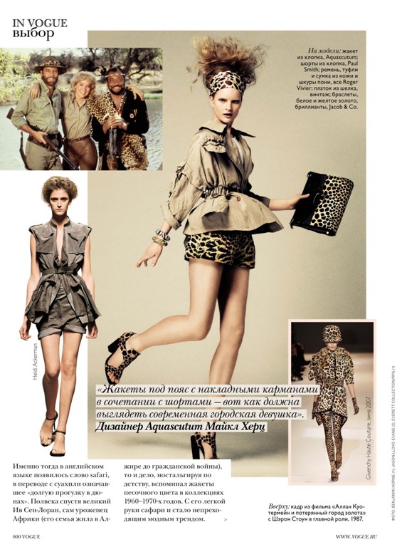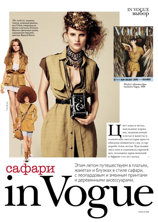 Этим летом Vogue предлагает путешествовать в платьях, жакетах и блузках в стиле сафари, с леопардовыми и змеиными принтами и деревянными аксессуарами. «Жакеты под пояс с накладными карманами в сочетании с шортами – вот как должна выглядеть современная городская девушка», – по мнению дизайнера Aquascutum Майкла Херца. Сверх актуален цвет хаки и песка. Все это просто обязано появиться у вас в гардеробе этим летом. Как появились они в саквояжах европейцев, искавших приключения в Африке 100 лет назад. Именно тогда в английском языке появилось слово safari, в переводе с суахили означавшее «долгую прогулку в дюнах.
