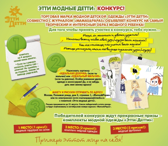 Анкету и рисунок нужно направить до 23 июля по адресу Москва, ул. Полковая, д. 3, стр. 1, Mamas&Papas или по электронной почте mamaspapas@imedia.ru с пометкой «Этти модные детти».