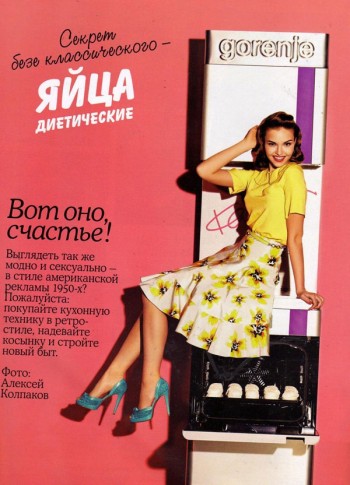 Модель Саша Ласс позирует на фоне холодильников и духовых шкафов. Строить «новый быт» «Vogue Гурман» предлагает в одежде Antonio Marras, D&G и Dior.