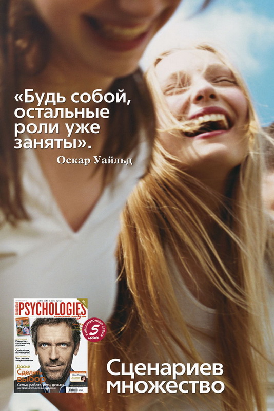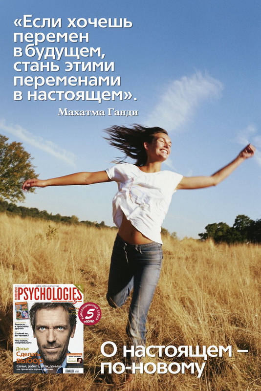 Рекламные имиджи и цитаты отражают такие ключевые ценности журнала, как уверенность в себе, вера в собственные силы, открытость сердца, радость в творческом труде и красота внутренней гармонии. Пять ответов PSYCHOLOGIES мотивируют читателя по-новому взглянуть на мир, найти себя и сделать свой выбор.