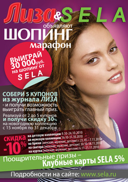 Любишь стильно одеваться? Читаешь каждый номер «Лизы»? Тогда эта акция для тебя! Купи один из пяти журналов «Лиза» (№ 42—46) и вырежи из него купон. Приди с ним в любой магазин Sela и получи скидку 10% на указанную в нем группу товаров. Собери все 5 купонов, пришли их в редакцию или предъяви в магазине Sela и получи возможность выиграть главный приз — сертификат номиналом 30 000 рублей на шопинг в Sela. Ты также можешь получить скидку 30% на новогоднюю коллекцию с 15 ноября по 31 декабря, отоварив от 2 до 5 купонов! Поощрительные призы участницам акции — клубная карта со скидкой 5%.