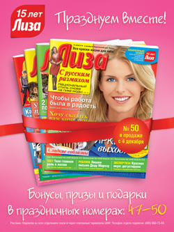 Самый популярный в России еженедельный журнал для женщин «Лиза» празднует в этом году 15-летие! Каждую неделю тиражом 720 000 экземпляров журнал выходит в объёме более 100 страниц. За 15 лет существования на Российском рынке, издание росло и менялось вместе с читательницами и стало за это время признанным лидером в своем сегменте. Еженедельная читательская аудитория одного номера составляет 3,5 миллиона человек.