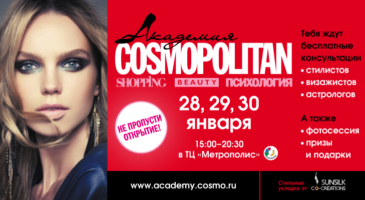 Более 16 лет Cosmo – главный советчик в вопросах красоты, моды, стиля, отношений. А теперь Cosmopolitan станет еще ближе и интерактивнее! В январе 2011 года открывается Академия Cosmopolitan.