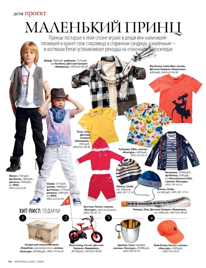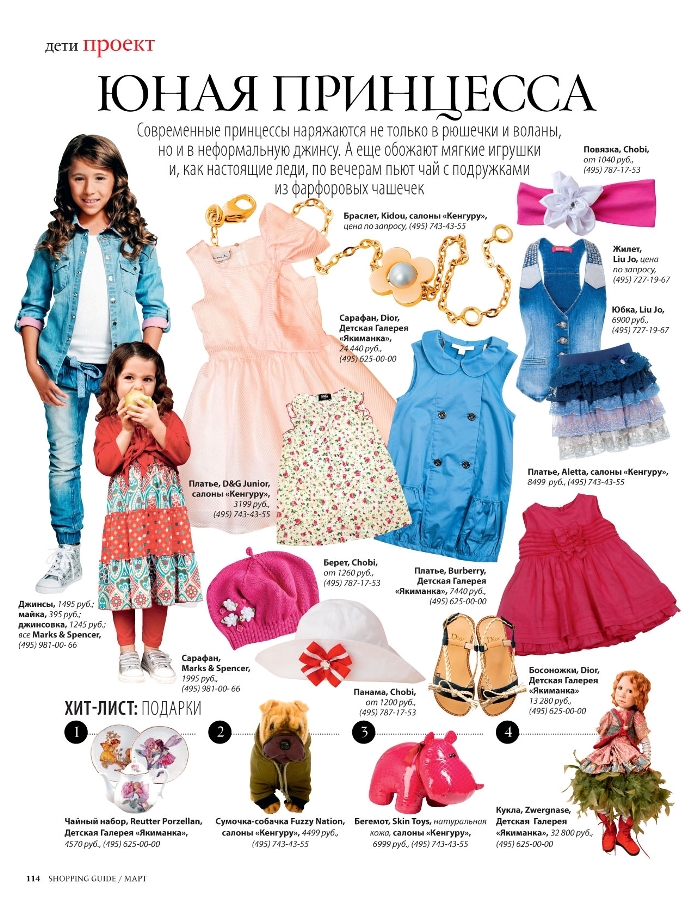 Какой наряд подобрать своей маленькой принцессе для школьного бала? Как составить повседневный гардероб юного денди? Без каких атрибутов не обойтись современному школьнику? О каком подарке мечтают дети? Ответы на эти и другие вопросы – ежемесячно в детской рубрике журнала Shopping Guide. Каждый месяц эксперты журнала представляют лучшие предложения по шопингу для детей, дают рекомендации по созданию стильных и эффектных образов для юных модников, делятся самыми актуальными новостями из мира детской моды – делают все, чтобы Ваш ребенок был образцом для подражания.