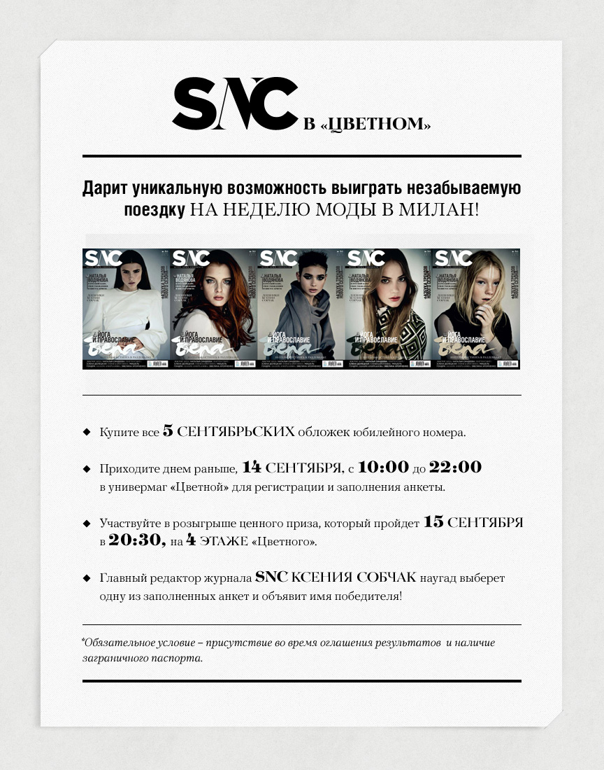 Чтобы оказаться среди 10 финалистов, зайдите на сайт SNC, прочтите задание редакции, выполните его и отправьте по адресу: snc@artcommedia.ru. Следите за обновлениями на странице SNC в facebook: sncmagazine.ru и www.facebook.com/sncmagazine, редакция выберет 9 претендентов, а 10-го участника путем голосования отберут читатели SNC!