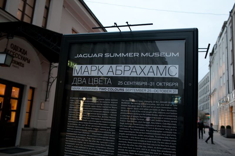Сезон фотовыставок в Столешниковом переулке представляет бренд Jaguar. Автомобиль Jaguar станет достойным элементом в ретроспективе чистых линий и форм от Марка Абрахамса. На протяжении всего сезона 2012, продолжая успех прошлых лет, проект поддерживает журнал GQ. Открытие выставки пройдет при участии бренда Mamont – одной из самых изысканных водочных марок, производимых в России.