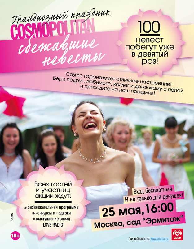 Музыкальное настроение гостям гарантирует концерт Love Radio с выступлением самых ярких звезд. Ведущий праздника диджей радиостанции Руслан Полянский проведет финал эфирного конкурса, главный приз которого – сертификат на 100 тыс. рублей на организацию свадьбы мечты, а очаровательные Love Angels на аллее Love Radio подарят гостям любовные признания на разных языках мира. Изюминка праздника в этом году – свадьба главного редактора Cosmopolitan Али Баданиной, которая состоится незадолго до праздника – 22 мая. Завершится праздник коллективным киданием 100 букетов невест.