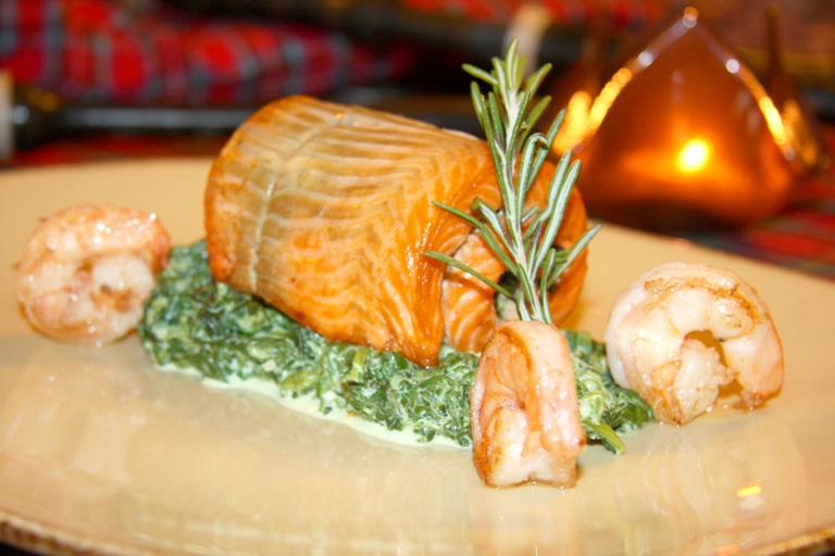 Филе нерки со шпинатом - Подается со шпинатом томленым в сливках и обжареными креветками (950 руб)