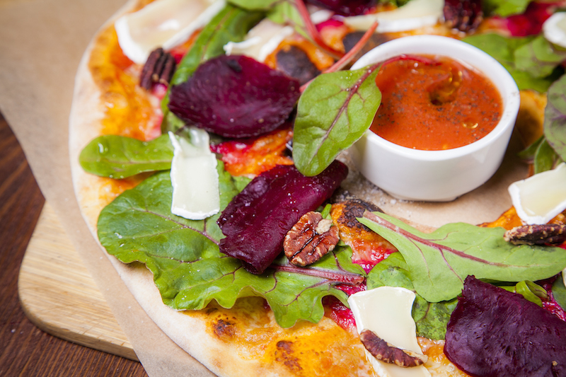 Печеная свекла с сыром бри, грецким орехом, мангольдом и фирменным свекольным чизкейком