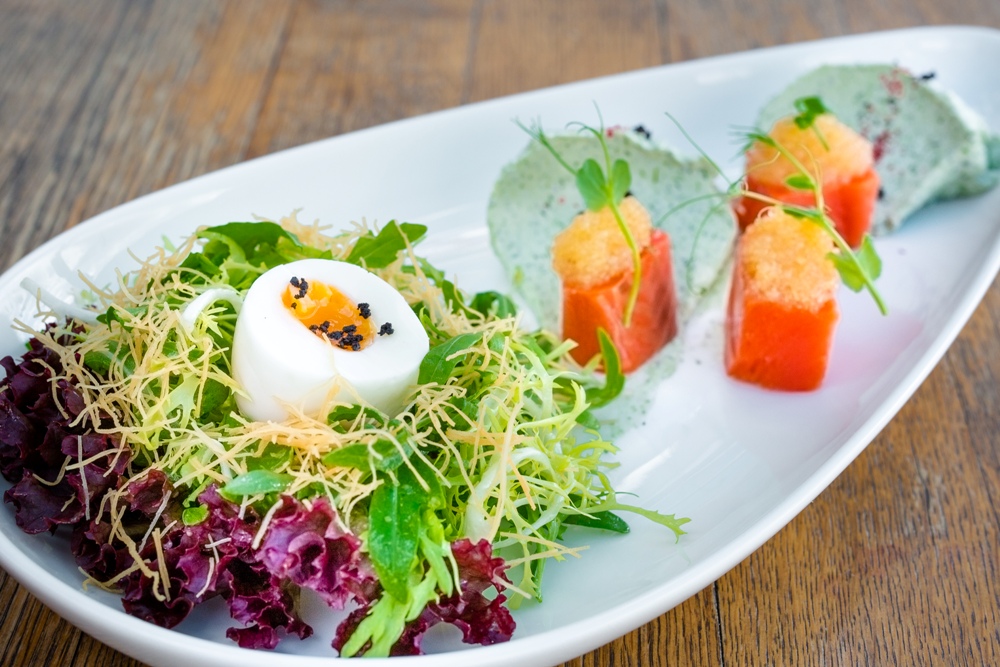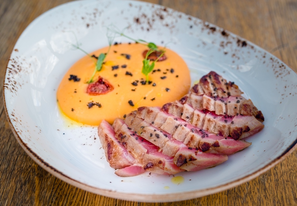 При приготовлении блюд Карло старается использовать локальные продукты, российскую мраморную говядину, рыбу и фермерскую птицу. В летнем меню бренд-шеф представил легкий и освежающий вишнево-томатный гаспачо с овощами (350 руб.) и окрошку на квасе с куриной грудкой (290 руб.). В разделе закусок и салатов — тартар из говядины Black Angus (660 руб.) из российской говядины 120-дневного зернового откорма, подается с крошкой из бородинского хлеба и перепелиным желтком; тартар из тунца с муссом из авокадо (490 руб.) со сладким перцем и соусом «баджи», сервируется икрой из щуки на рисовом чипсе; тартар из слабосоленой нерки, яблок и бальзамического желе (580 руб.) с маринованными в соке маракуйи яблоками; легкий салат капрезе с клубникой и томатами (590 руб.) с моцареллой и ароматной краснодарской клубникой, украшенной «землей из маслин»; брускетта из бородинского хлеба с молодым картофелем и бочковой селедкой (380 руб.) подается с маринованным луком-шалотом и воздушным соусом из хрена. Для салата из подкопченной свеклы с зернистым творогом (400 руб.) свекла сперва запекается в духовке, а затем коптится в коптилке с добавлением ольховых опилок, маринуется в бальзамико и подается с зернистым творогом, заправленным домашним песто из петрушки.