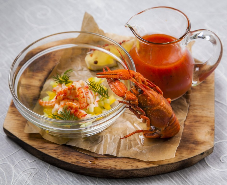 - Холодный, томатный суп с раками и семечковым маслом 320гр. - 450р.