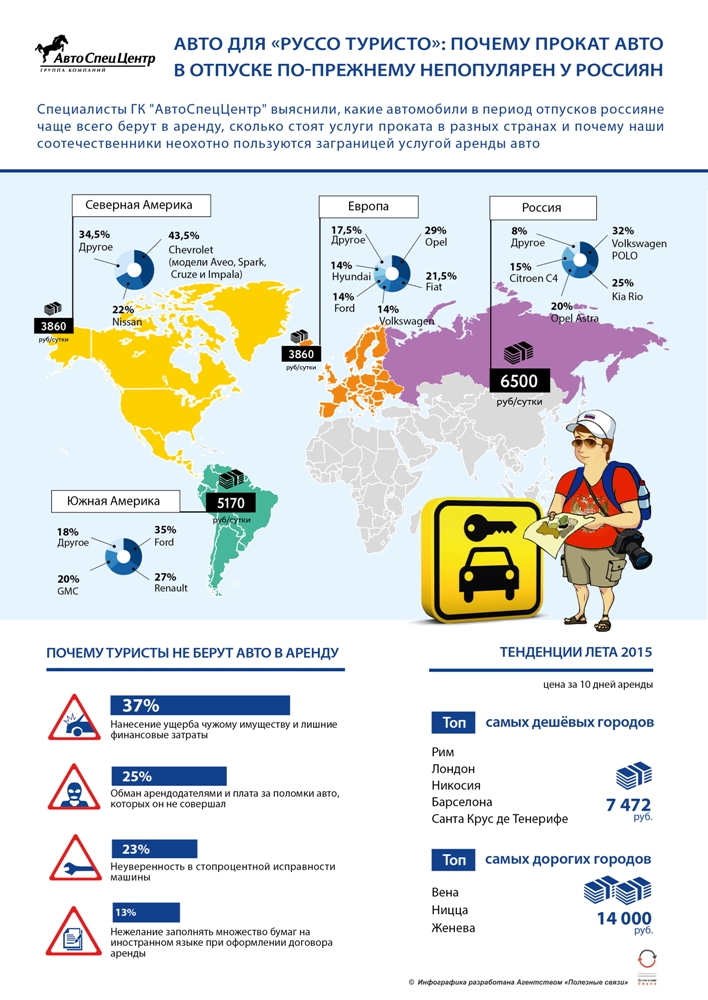 С началом сезона отпусков 2015 специалисты ГК «АвтоСпецЦентр» провели опрос среди посетителей дилерских центров и выяснили, какие автомобили они предпочитают арендовать во время отдыха в нынешних условиях кризиса. Приезжая в Европу, путешественники отдают предпочтения компакт-карам и машинам эконом-класса. Средняя стоимость аренды за сутки составляет 3860 руб. Чаще всего клиенты выбирают такие марки, как Opel (29%), Fiat (21,5%), Volkswagen (14%), Ford (14%), Hyundai (14%) и другие авто (7,5%).Большая часть россиян в Европе предпочитают автомобили с механической трансмиссией из-за дешевого обслуживания и невысокой стоимости аренды по сравнению с коробкой-автоматом – разница в цене составляет около 20%. В Северной Америке чаще всего берут автомобили эконом-класса с АКПП, средний чек которых составляет также 3860 руб. за сутки. Что касается модельного ряда, здесь наиболее популярна марка Chevrolet (модели Aveo, Spark, Cruze и Impala) – 43,5% всех арендуемых авто. На втором месте стоит Nissan – 22%.Во время поездки в страны Южной Америки, отдыхающие предпочитают выбирать эконом-класс с механической коробкой передач. Средняя стоимость аренды за сутки составляет 5170 руб. Выбор автомобиля падает на три основные марки Ford, Renault и GMC. Что касается стран Восточной Азии, класс выбранного авто зависит от конкретной страны. Путешественники могут выбрать машину компакт-класса или внедорожник, средняя цена составляет 3600 и 6400 руб. соответственно. При выборе марки отдыхающие в Азии россияне предпочитают Hyundai (36%), Ford (27%), Toyota (18%).Большинство туристов выбирают машину с автоматической трансмиссией. Пакет услуг аренды в разных странах стандартен и включает в себя: налог на добавленную стоимость, локальные сборы (контрактные или лицензионные сборы, государственный налог и прочее), страховку и плату за пробег. В ряде стран в счет может входить стоимость дорожных налогов.