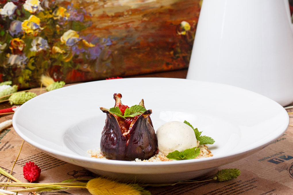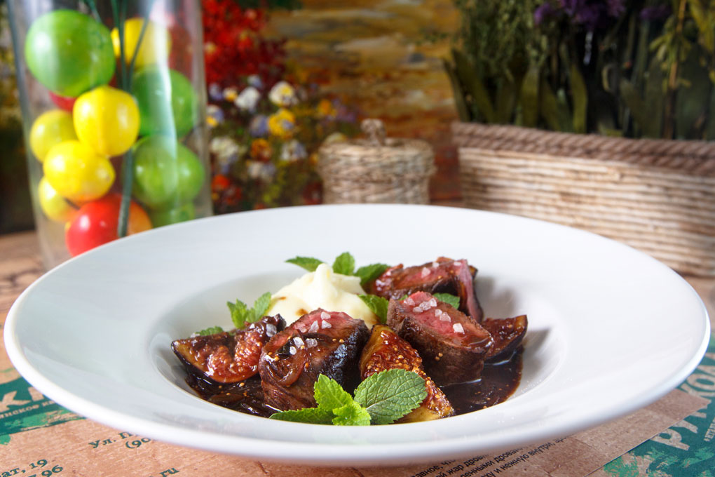 Пицца с инжиром и копченой уткой – это классическая пицца маргарита, но украшенная сезонными специалитетами: на тонкое тесто пиццы выкладывается нарезанный инжир и запекается до золотистого цвета, после этого добавляются слайсы копченой утки и листья свежей рукколы. Для лопатки с томленым инжиром стейк из охлажденного воронежского мяса сначала обжаривают на гриле до стадии medium well и нарезают на небольшие медальоны. Инжир слегка обжаривают с небольшим количеством сладкого лука, добавляют сахарный песок, куриный бульон, сливочное масло и затягивают бальзамическим кремом. Этот соус вместе с пюре из сельдерея подают к мясу. Салат с инжиром и цукини готовят с добавлением долек апельсина, листьев латука, фризе и украшают медовым бальзамиком, розовым перцем и чипсами из томата. А ставший уже классическим авторский десерт Виктора Апасьева – карамелизированный инжир с ванильным мороженым – подают на подушке из хрустящего бисквита и украшают клубничным соусом.