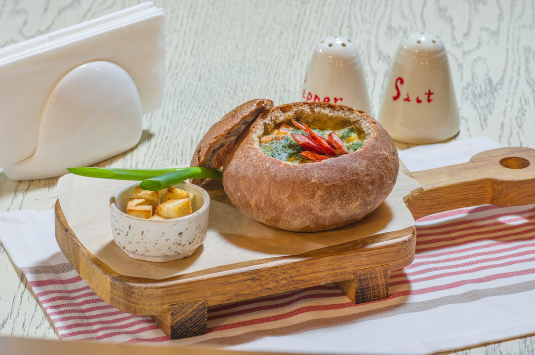 В обеденное время рекомендуется попробовать новые супы: суп-пюре из грибов (290 руб.), а также наваристый гороховый суп с копченостями и белыми гренками (320 руб.), который подается в ржаном хлебе.
