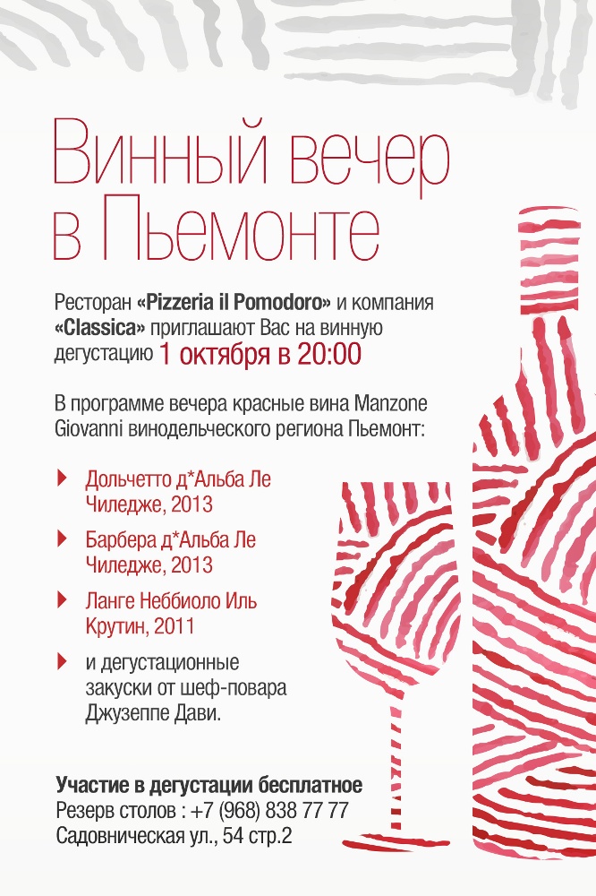Ресторан «Pizzeria il Pomodoro» и компания «Classica» приглашают 1 октября отправиться в путешествие по винодельческим регионам Пьемонта.