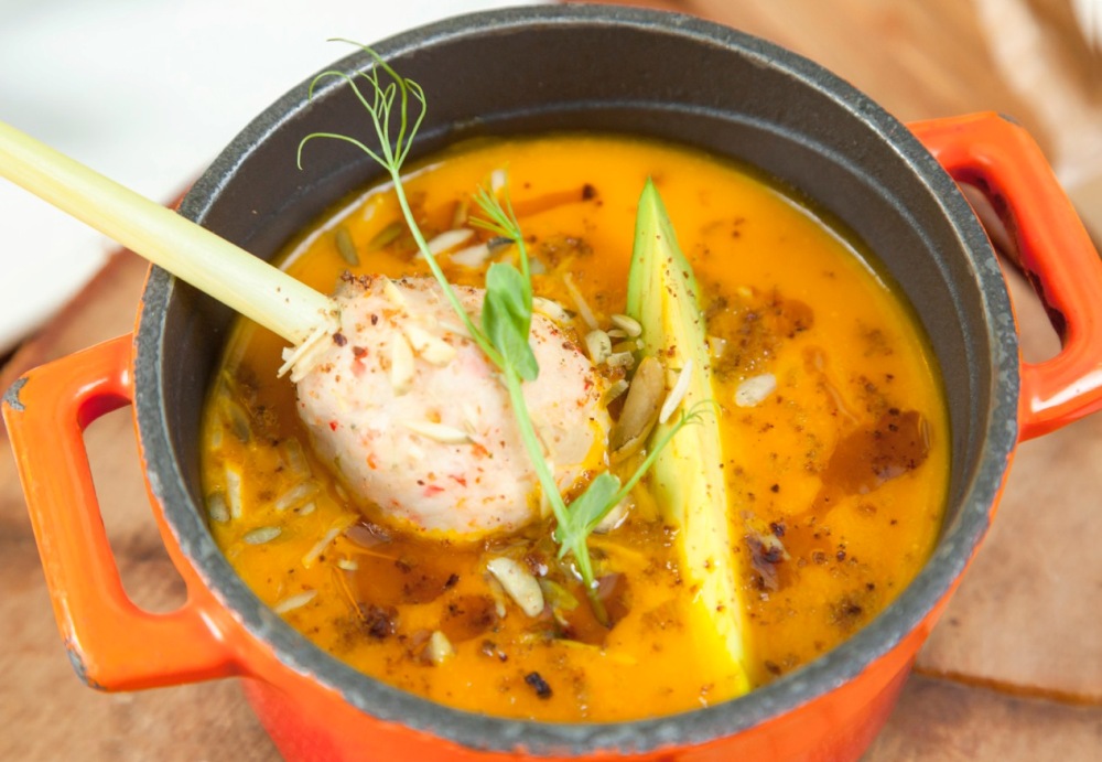 Крем-суп из тыквы с авокадо и крабовым митболом