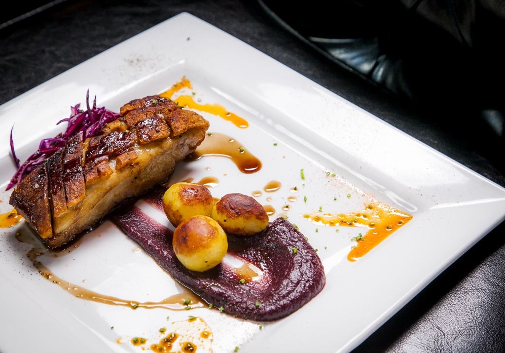 Свинная грудка с краснокочанной капустой и тушеной сливой