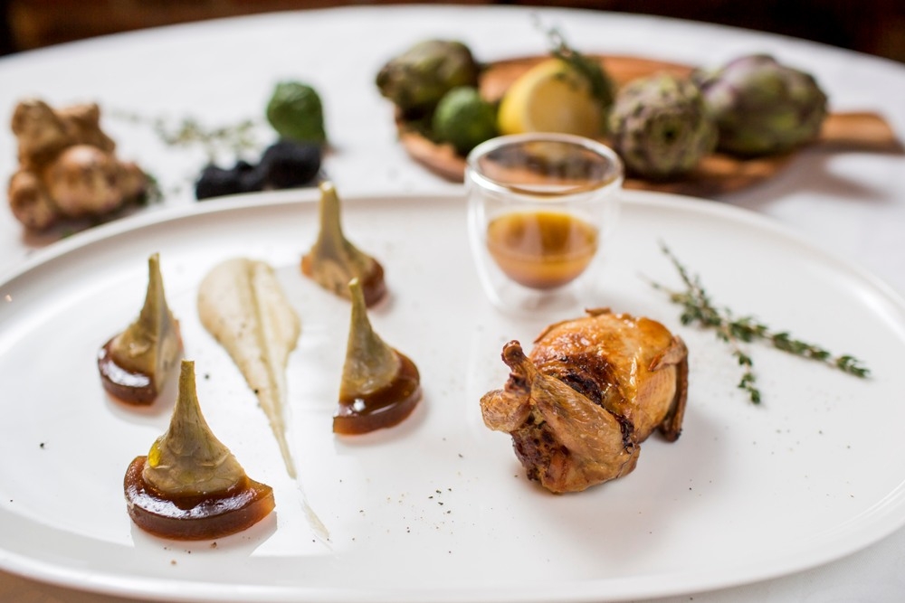 Вот традиционный рецепт – маринованные артишоки: шеф готовит их в оливковом масле и лимонном соке. Можно заказать на закуску или в качестве гарнира, и отличный вариант – взять карпаччо из говядины с маринованными артишоками и черным трюфелем. А еще артишоки играют важную роль в одном из самых популярных блюд Le Restaurant, перепелке со сливочной эспумой. Их отваривают, затем фаршируют муссом из белого мяса птицы с белыми грибами и трюфелями, а после этого выкладывают их в грибной бульон с добавлением агар-агара и отправляют в холодильник до полного застывания. Из желе потом вырезают кружки таким образом, чтобы стебель артишока был в центре. Получается очень эффектно.
