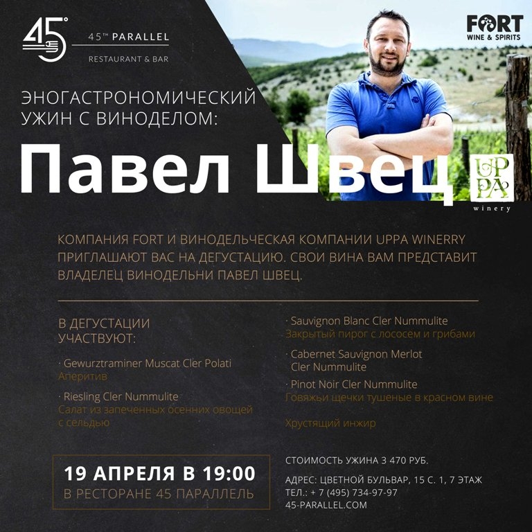 19 апреля в ресторане «45-я параллель» пройдет эногастрономический ужин от бренд-шефа Режиса Тригеля. На вечере свои вина представит Павел Швец – основатель и владелец винодельни Uppa Winery.