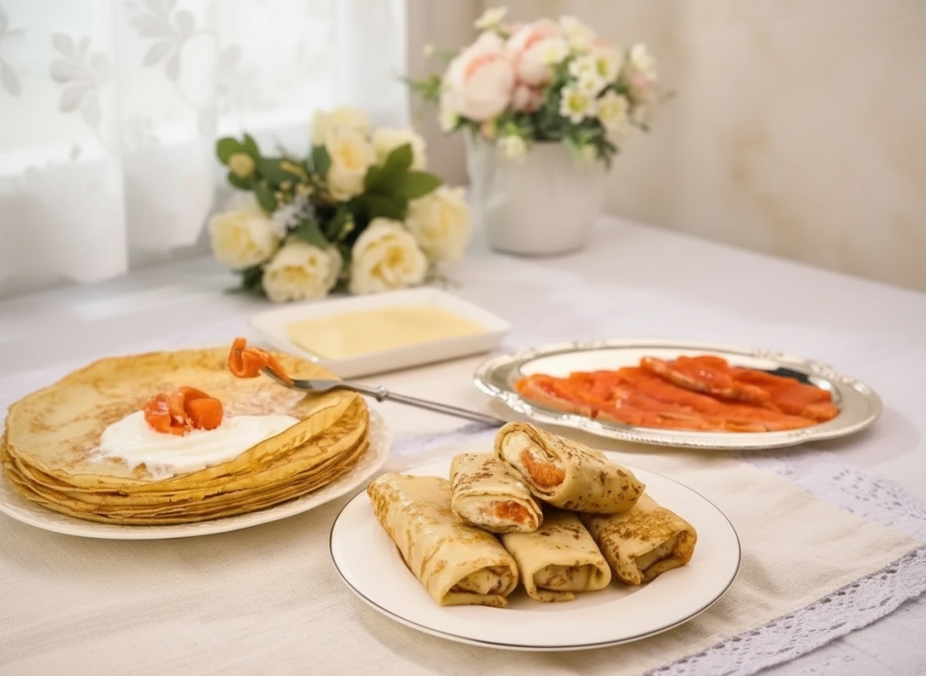 Особое место в ассортименте по случаю Масленицы отводится изысканной закуске к праздничному столу — блинам со слабосолёной форелью и творожным сыром.