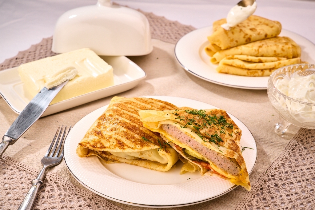 В качестве самостоятельных сытных блюд здесь выступают блины с мясными начинками. Это большой блин «Чизбургер» с сочной котлетой из микса свинины и филе куриной грудки, сыром Чеддер, сладкими томатами и хрустящими маринованными огурцами; блинчик с ремесленной ветчиной из индейки и сливочной моцареллой, а также блинчики по авторскому рецепту шеф-поваров КуулКлевер: с мясом курицы, грибами, луком, болгарским перцем и соусом бешамель из натурального фермерского молока и настоящего сливочного масла.